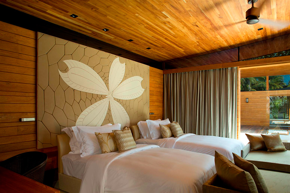 Sus interiores de madera aportan calidez, que combinan con mobiliario de líneas rectas y de inspiración étnica, así como los tonos neutros con otros más cálidos como los naranjas y rojos. Los espacios abiertos del interior de las villas comunican con el exterior y ofrece unas vistas impresionantes al mar y la piscina que rodea cada villa.