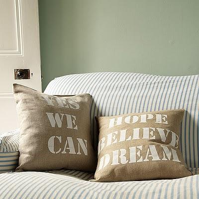 Los cojines tipográficos están muy de moda y le dan un aire muy moderno y divertido a la decoración.