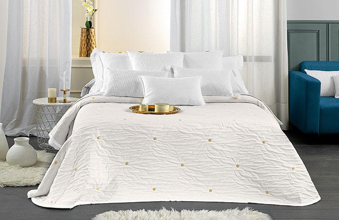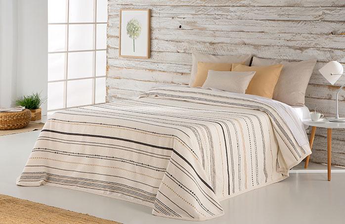 Los tonos crudos en colchas de verano son un clásico infalible tanto por su estilo impecable, como por su bonito efecto decorativo. Confeccionadas en 100% poliéster, los modelos en colores crudos de colchas tipo capa de Cañete son prendas modernas y muy elegantes. Por un lado tenemos la colcha capa Fayna, texturizada y con un bonito detalle de lunares bordados; por otro, la colcha capa Mayday, formada por cenefas con detalles de inspiración geométrica.