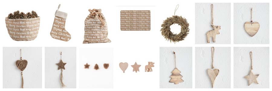 Cesto de yute 20,30x25,40cm. (3,99€), Calcetín de yute 24x18cm (2,99€), Saco de yute 56x38,10cm (3,99€), Individual 13x19cm. (3,99€), Corona de plumas (desde 2,99€), Colgantes de madera en forma de reno, corazón, árbol y estrella aprox. 10x12cm (desde 1,99€), Colgantes con pelo en forma de corazón y estrella 15x48cm. (2,99€), pack de 6 pinzas iguales con pelo 4x4cm. (1,99€) y pack de 6 pinzas iguales de madera 4,5x4,5cm (2,50€.)
