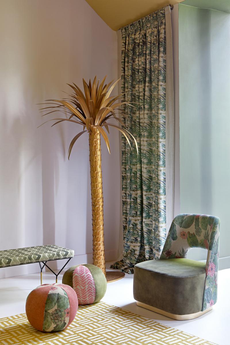 Foresta se compone de cuatro diseños principales en formato grande y con motivos botánicos (hojas de palmera, de bambú, floridos cactus y peonías), que se combinan cada uno de ellos con estampados geométricos de escala más pequeña (rayas, espigas…). Todos los dibujos están pintados utilizando el estilo artístico de acuarela. Esta colección se realiza en un ancho de 2,80.