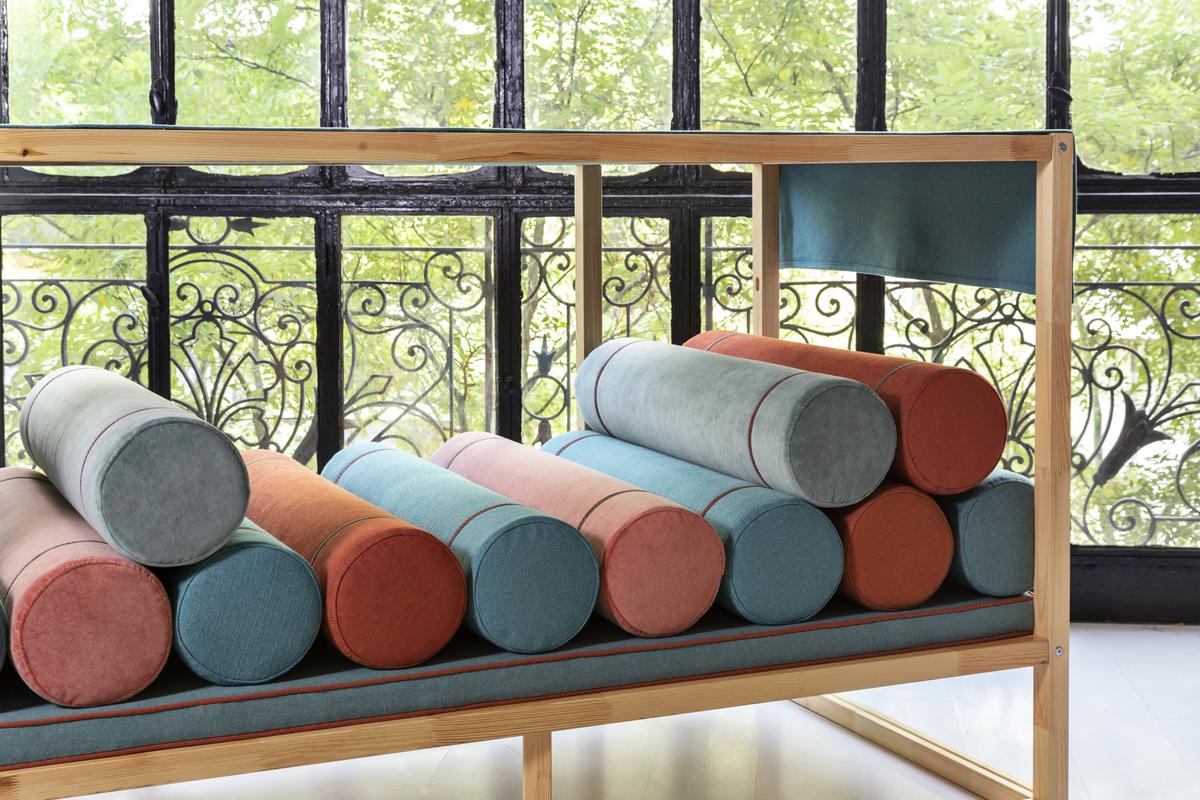 Se compone de un liso con textura de espiga, un zigzag bicolor y un falso liso de doble cara, todos en una amplia gama de colores y con alta resistencia al desgaste (40.000 ciclos Martindale). Los tonos son atrevidos y de plena actualidad -para hoteles de playa- como el mostaza, el teja, el coral, el verde menta, el azul Klein o el petróleo, y se complementan con otros más neutros, fácilmente combinables, como el azul marino o el verde bosque, y tonos terrosos, en la gama de los marrones y de los grises, perfectos para hoteles urbanos.