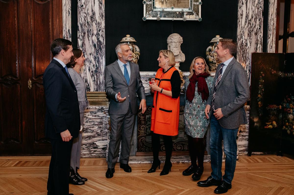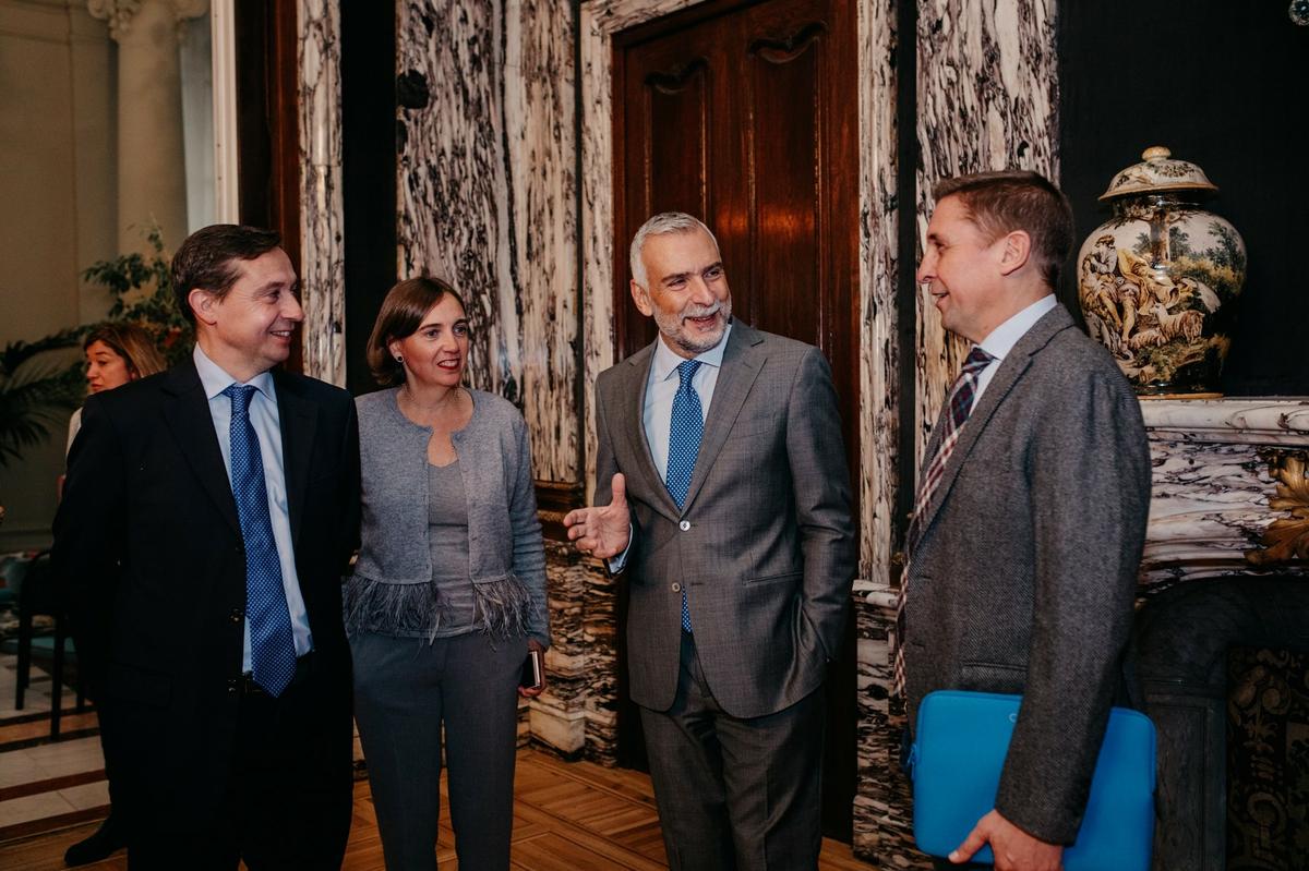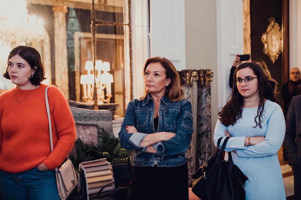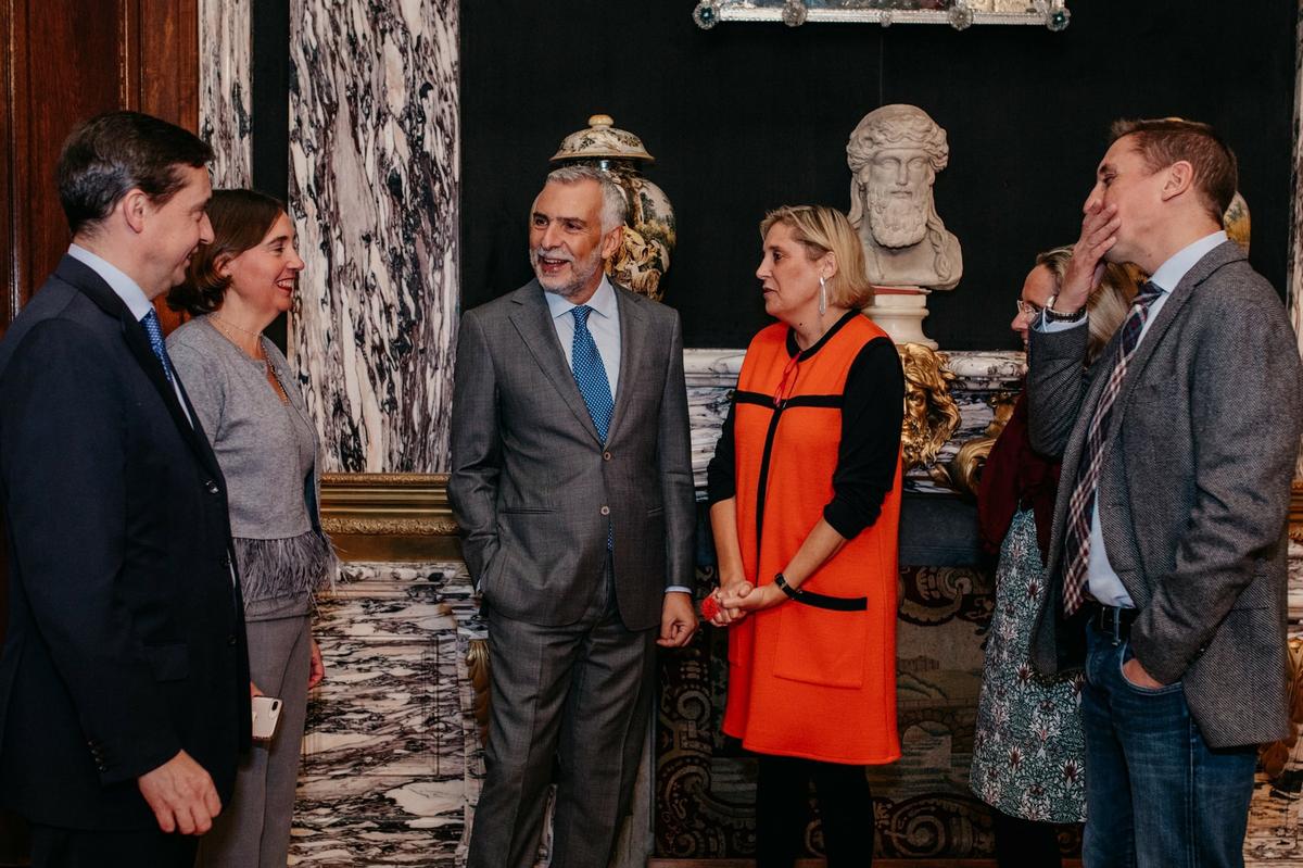 No en vano, la Embajada y Gancedo han colaborado conjuntamente en un proyecto de renovación de los espacios del comedor y el salón de fumadores, cuyas paredes se han entelado de forma atrevida y original con terciopelos gris antracita y de diseño geométrico (Pináculo) respectivamente, encajándose ambos a la perfección con los clásicos espacios del palacio.