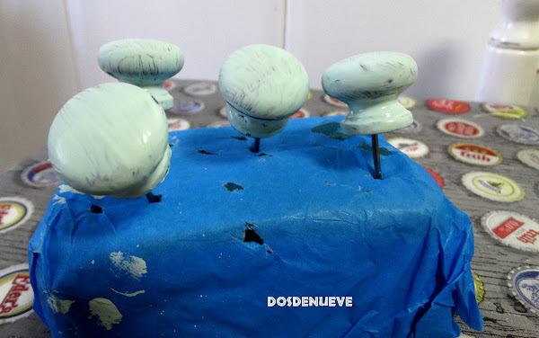 7. Sólo nos falta colocar nuestros colgadores. En esta ocasión, hemos elegido unos de diseño muy sencillo que hemos decorado con los mismos tonos que el resto del conjunto. Eran de madera y estaban barnizados en un tono muy oscuro, así que los hemos pintado con el verde mint, Una vez seca la pintura les hemos dado una lijada suave y, como protección final, barniz en spray.
