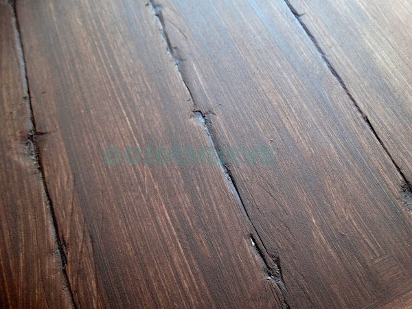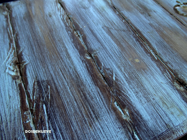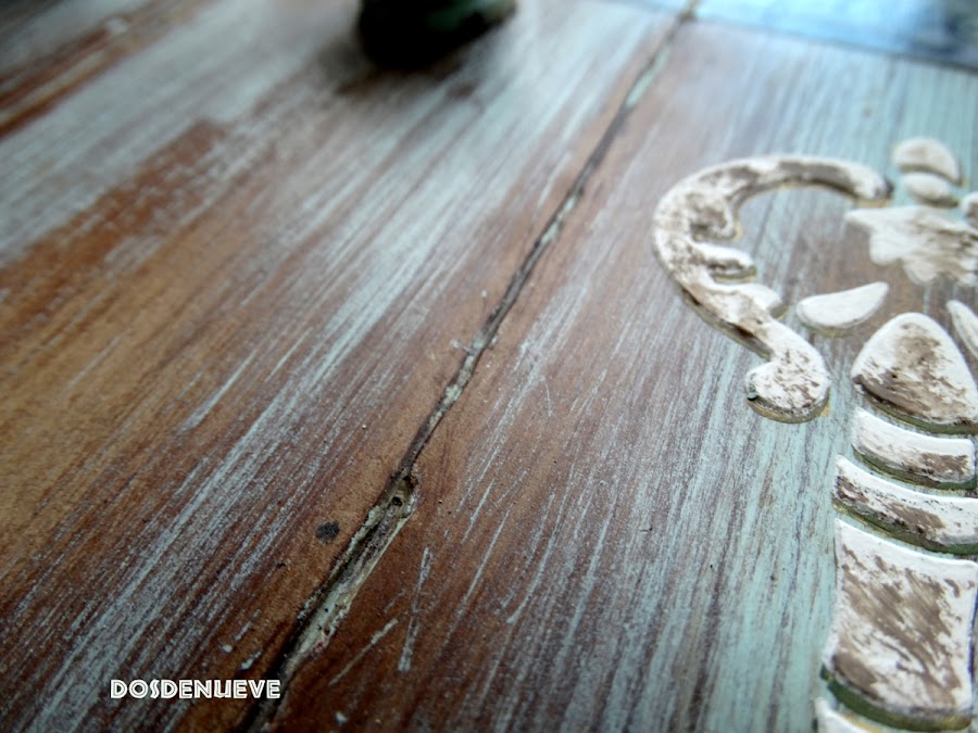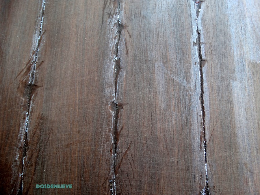5. Con ayuda de una lija vamos decapando la superficie consiguiendo este efecto de madera veteada. En las zonas donde hemos aplicado la cera el lijado resulta sencillísimo.