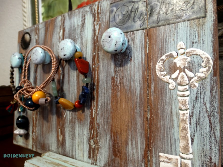 6. Ya hemos terminado con la base de nuestro colgador de pulseras, así que sólo nos queda decorarlo a nuestro gusto. Para ello hemos pegado en la parte superior dos detalles de papel encerado y en uno de los laterales hemos realizado un estarcido en relieve, al que posteriormente hemos dado unos toques de pintura.