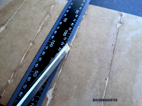 2. Colocamos la regla metálica sobre las líneas que hemos marcado y comenzamos a hacer unas hendiduras con ayuda de un cútter o herramienta que tengamos (en nuestro caso, un formón). Lo hacemos de forma bastante irregular porque queremos que el efecto final sea lo más natural posible.