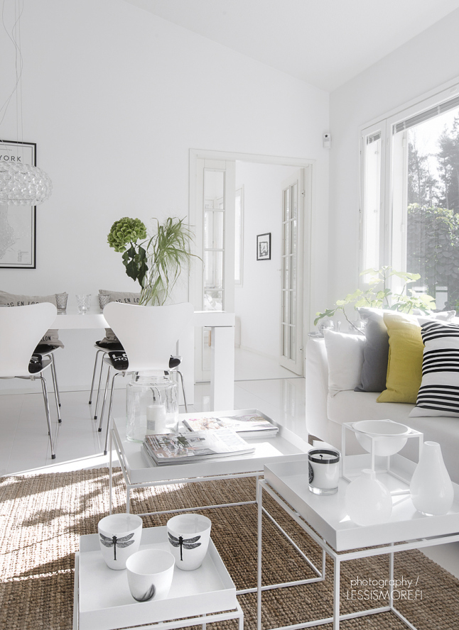 Basada en el blanco utiliza el contraste con el negro, y en algunos detalles como alfombras o muebles, el resto de la casa apuesta por la calidez de la madera y el uso de neutros