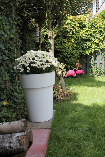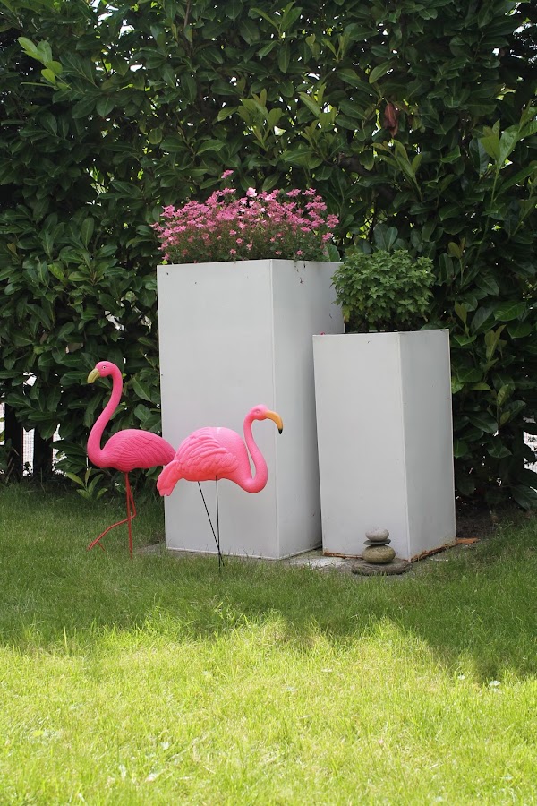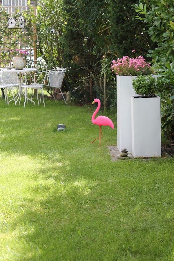 En el jardín, figuras de aves y colores que me recuerdan a mi amada tierra tropical (Colombia).