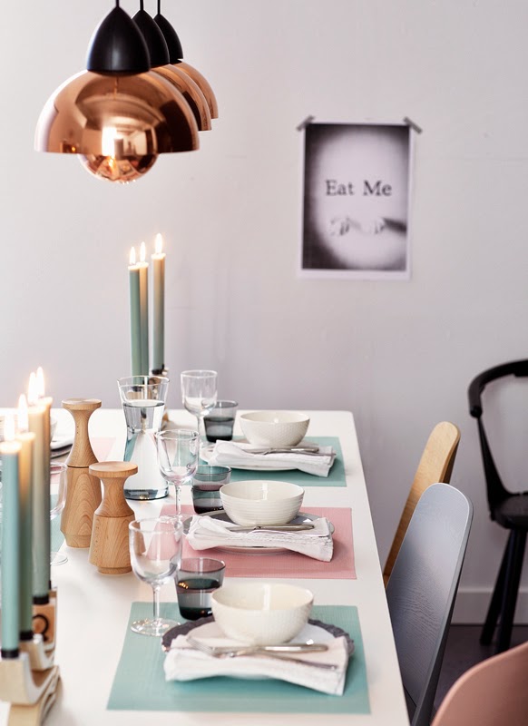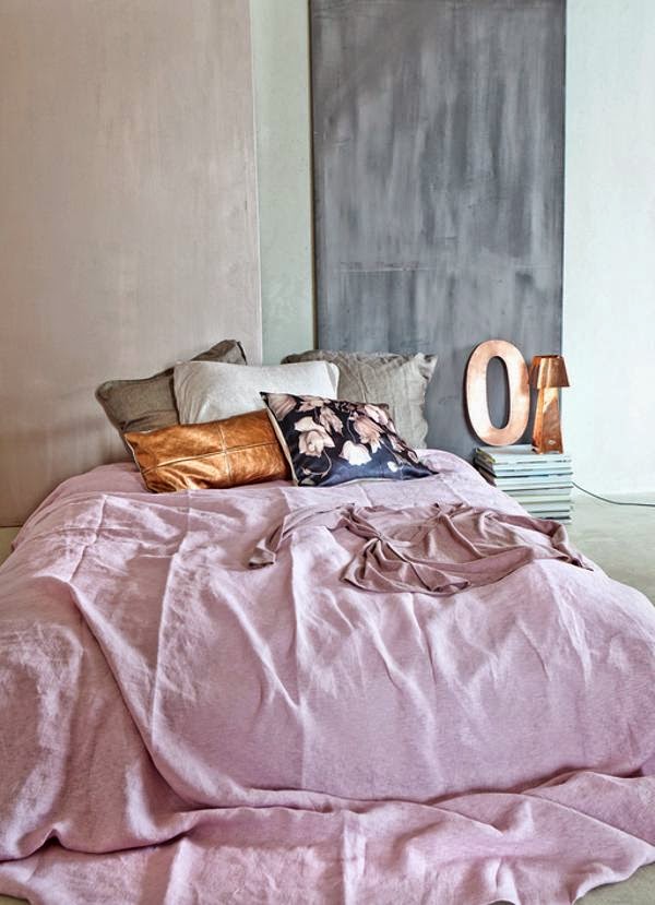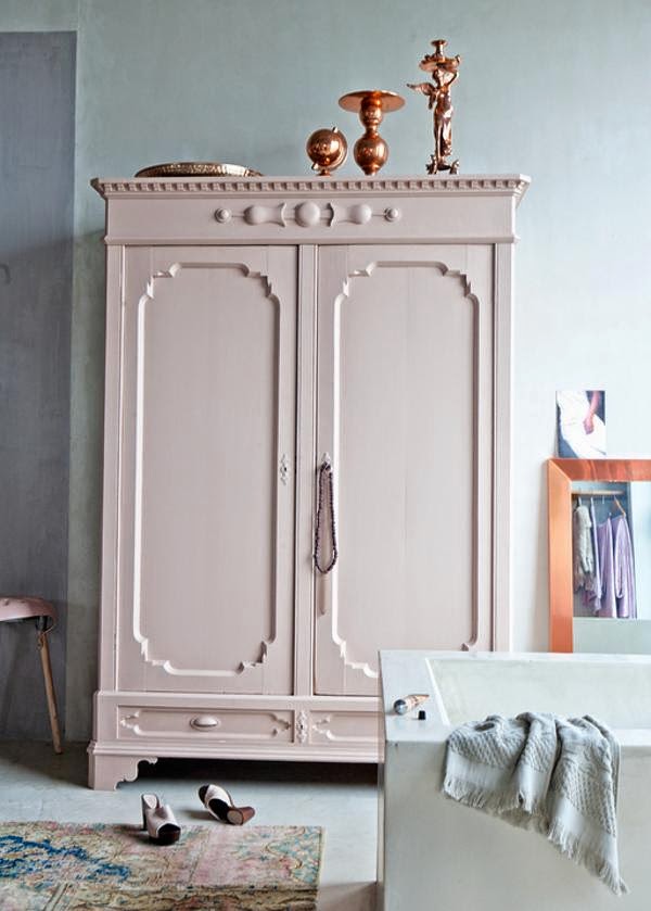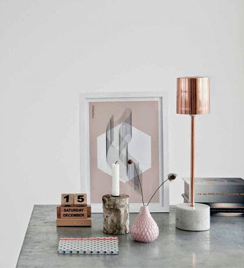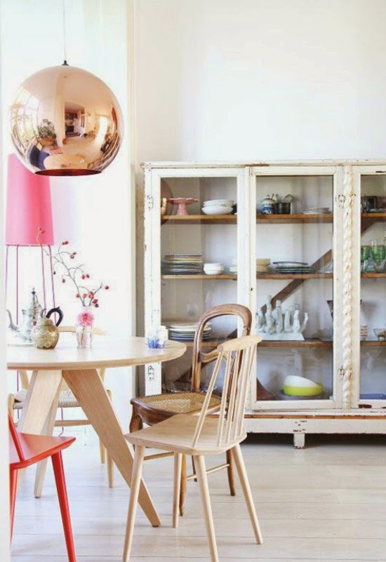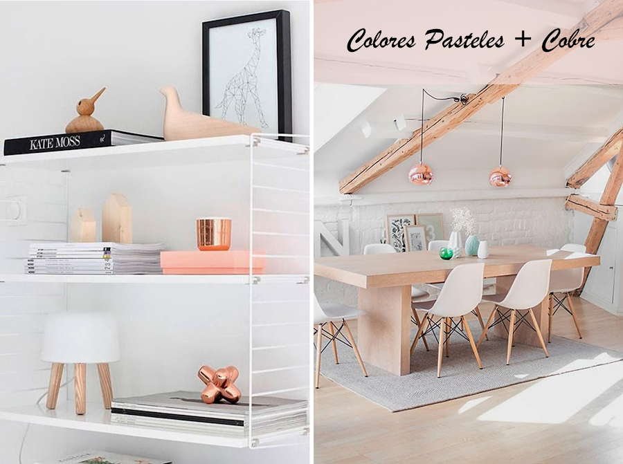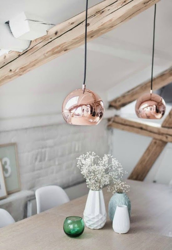 En las imágenes de hoy los protagonistas son los colores pasteles y el cobre, dos elementos decorativos de total tendencia para esta primavera-verano 2014. Si por separados crean diseños maravillosos, en combinación crean conjuntos decorativos fantásticos. Sobre un fondo en tonos pasteles, bien sea en paredes, piezas de mobiliario o textiles, los matices en cobre de lamparas o elementos decorativos, realzan las gamas cromáticas creando composiciones armónicas. En post anteriores os he mostrado decoraciones en blanco y cobre, pero este metal es ideal para conjugarlo con el verde mint, rosa palo o salmón.