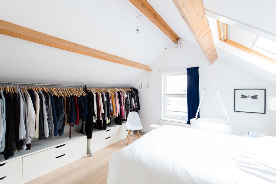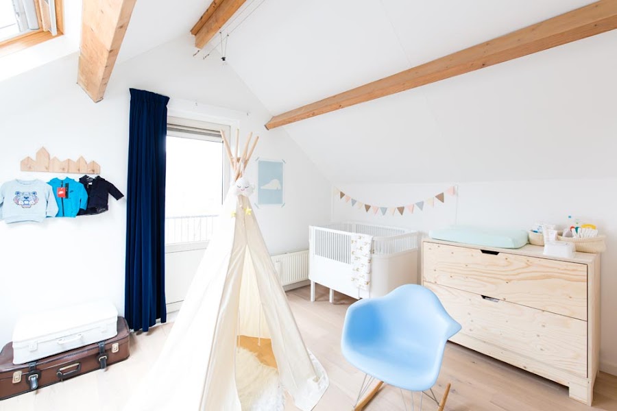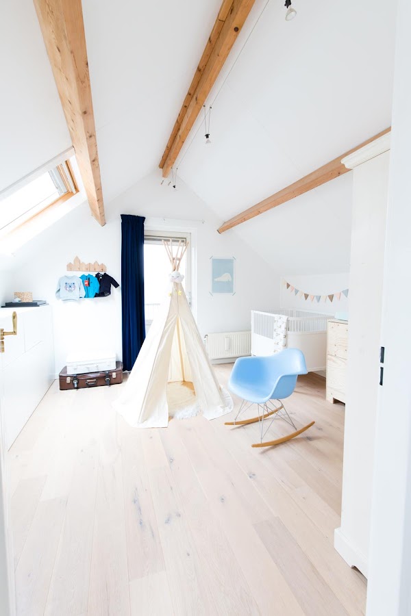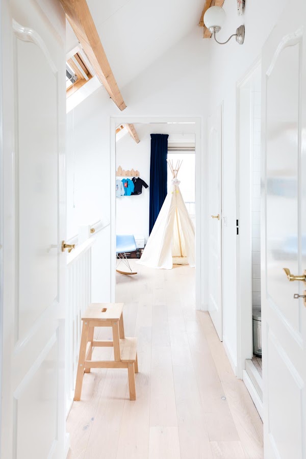 Si seguimos recorriendo este apartamento llegamos hasta la cocina, donde continúa el perfecto equilibrio entre los tonos pastel y la madera. La cocina es bastante sencilla, con los elementos necesarios pero sin muchas florituras. Y si subimos al piso superior nos encontramos ante un espacio en el que se respira mucha tranquilidad, tan necesaria para unas zonas de descanso como son los dormitorios. Por cierto de estos quiero destacaros un par de cosas. La primera es el armario visto del dormitorio principal. Tengo que reconocer que yo nunca podría tenerlo así de ordenado pero también hay que admitir que visualmente queda muy bonito. Y la segunda es el tipi del cuarto infantil, perfecto para vivir miles de aventuras sin salir de la habitación. Por cierto si quieres hacer uno parecido para tus hijos, en esta publicación puedes ver como hacerlo de una manera muy fácil (pincha aquí).