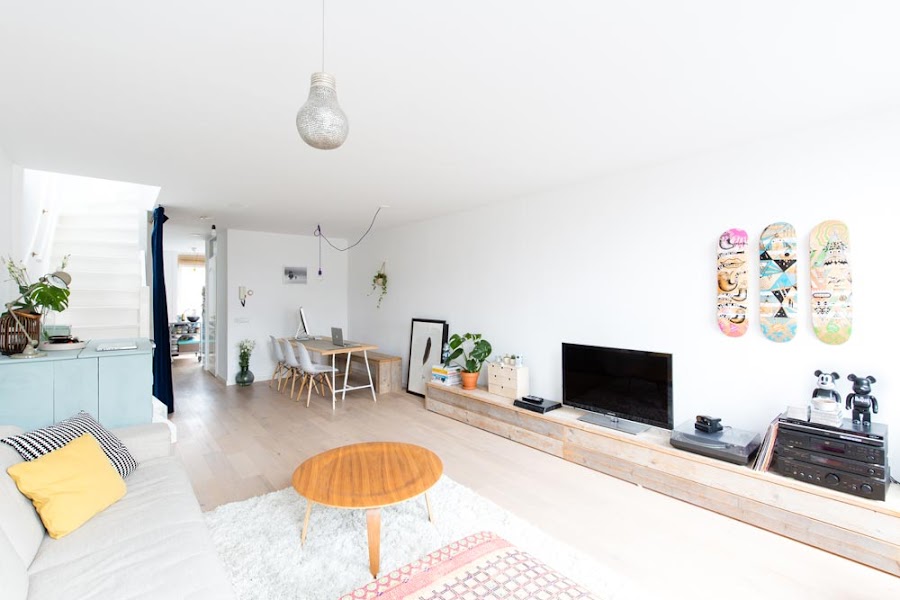 Como os comentaba y como podéis ver en la fotografías, los claros protagonistas de la decoración nórdica de este apartamento son los colores pastel y la madera. Si ya comenzamos por su amplio salón podemos ver un equilibrio perfecto entre estos dos elementos. A un lado los tonos pastel, con los textiles y algún mueble, y al otro lado la madera, con el mueble de la televisión (que me parece precioso pero espero que tenga algún cajón) y el banco de la zona de comedor a juego. La verdad es que en esta estancia se respira tranquilidad y armonía, y sin duda es un lugar perfecto para relajarse y simplemente disfrutar.