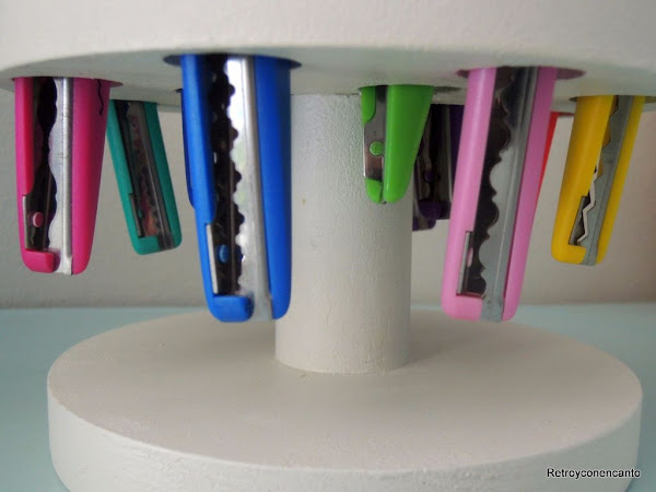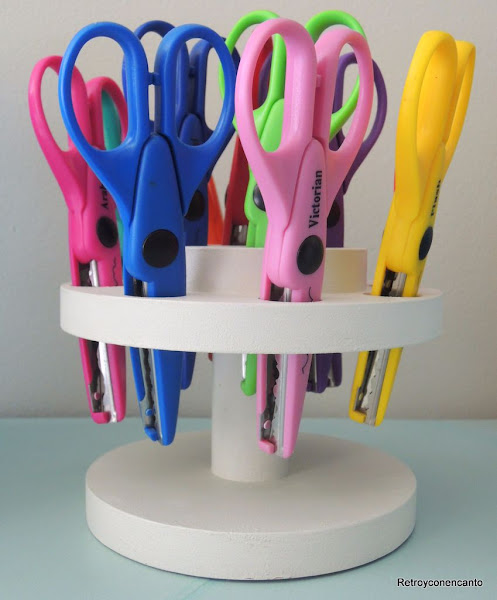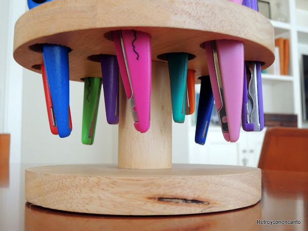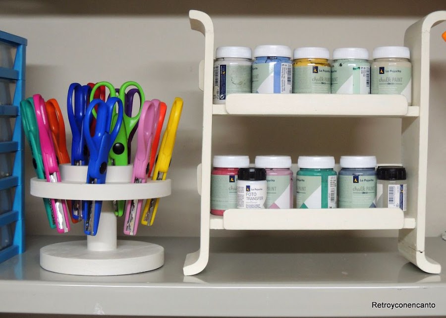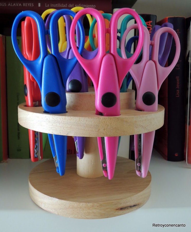 Estamos tratando de crear espacios bonitos en nuestro taller, ¡cosa harto difícil! Y aprovechamos el colorido de tijeras y pinturas para decorar con nuestras herramientas de trabajo. Junto a esta estantería que ya conocéis, y que ha cambiado de lugar y de función, ha encontrado el portatijeras su pareja ideal.