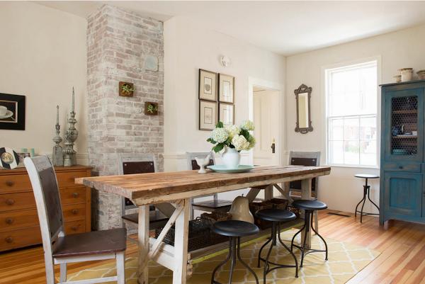 Un antiguo banco y unos taburetes de Boticario, le dan un toque industrial.