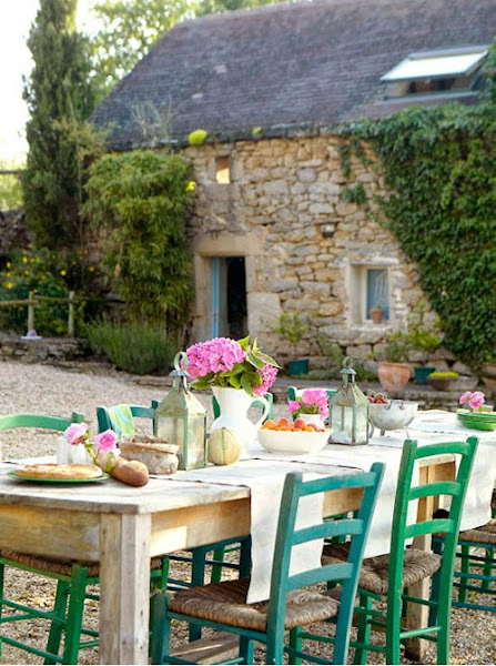 Este comedor de exterior, es muy original, se recuperarón sillas de enea diferentes y se pintaron de azul turquesa y de verde agua, el resultado un comedor muy alegre.