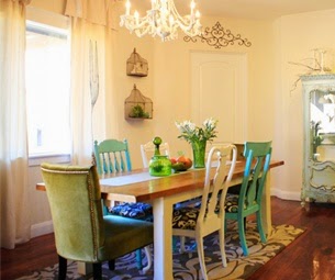 Comedor con sillas todas diferentes, las cuatro centrales se pintaron dos de blanco y dos de turquesa, la tapiceria igual para las cuatro y en la cabecera se colocaron dos tapizadas. El resultado es de un comedor estilo vintage.