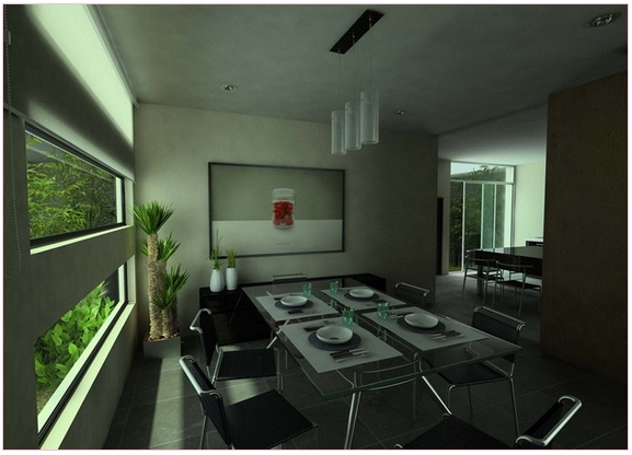 Ya que este comedor está ubicado en un espacio no muy grande, hay que elegir cuidadosamente el tamaño de la mesa, debido a que comparten el mismo espacio.