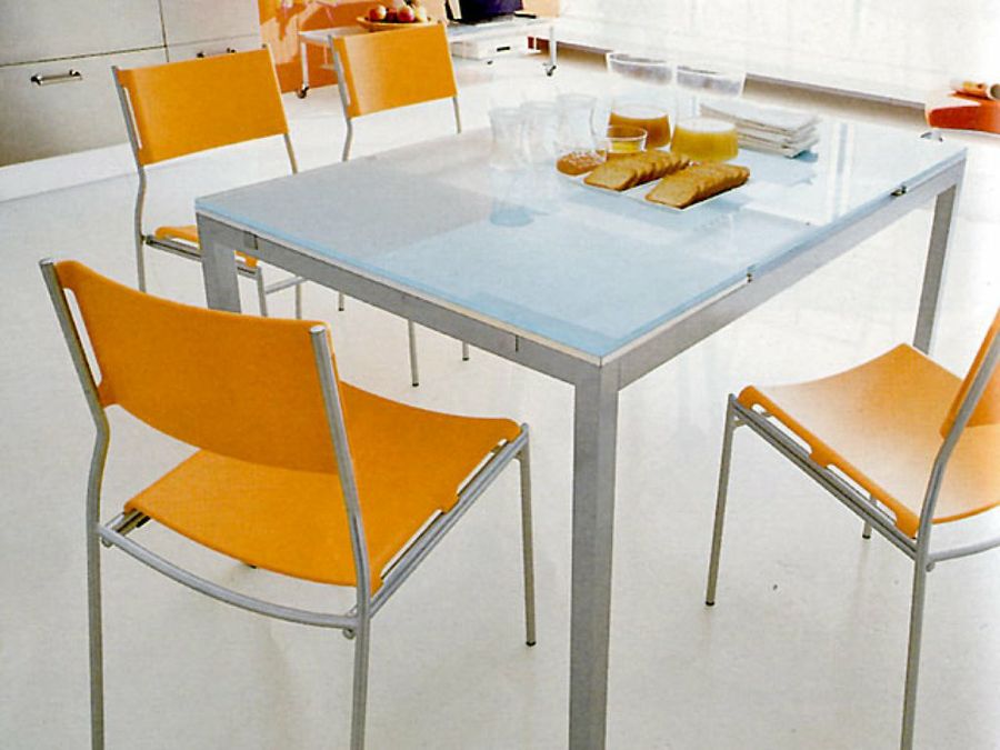 La firma italiana Calligaris nos presenta el modelo Cube, ideal para cocinas modernas y juveniles. Su estructura de líneas rectas fabricada en acero inoxidable con acabado satinado es la base del sobre de cristal esmerilado. Apropiada para seis comensales; sin embargo, albergará hasta ocho una vez que hayamos extendido sus extremos. Las sillas Sonica, disponibles en alegres colores, irán acordes con otros complementos de la estancia.