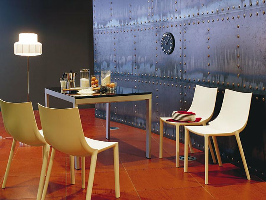 La mesa de cocina Dublín es otra de las ideas para las cocinas de último diseño. De acero y aluminio, la encontramos en diferentes tamaños, y la superficie de vidrio, en negro y blanco para ambientes sobrios y en rojo y naranja para los que quieren dar un toque luminoso a la estancia. La silla Bo, de líneas curvas y depuradas está fabricada en polipropileno.