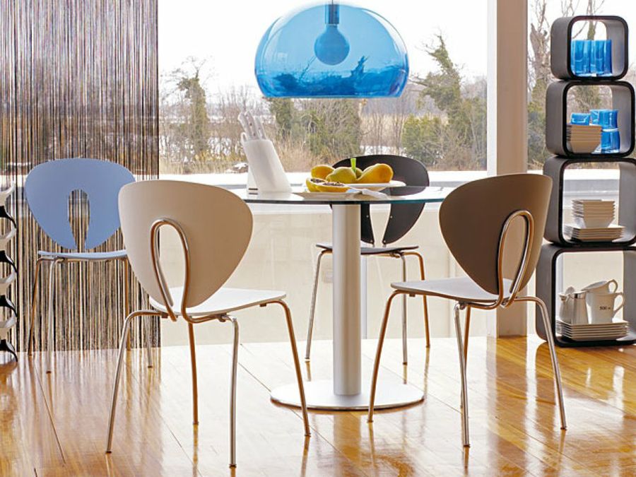En la misma línea que la anterior, Cross Road es una propuesta moderna para las cocinas más elegantes. La superficie circular pasa a ser ovalada una vez que la extendemos. Con el sobre de vidrio en dos tonos, se coordina con cualquier tipo de silla, clásica o moderna, según el resultado final que deseemos. Una idea de Calligaris es la silla Life, de teflón en vivos colores.