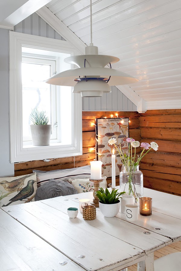 Una mesa reciclada es la pieza perfecta para un ambiente ecléctico en la que una silla de diseño y una lámpara retro hacen un trío con mezcla de estilo nórdico, vintage actual... el toque el cuadro de setas y champiñones con una sencillísima guirnalda de luces... si de luces propias de navidad.. un puntazo.