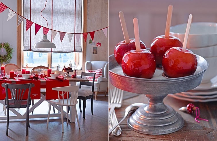 Nuestra favorita???? Pues la verdad es que nos encanta la mesa decorada en rojos, con sus manzanas caramelizadas, y los banderines que le dan un toque diferente y se sale de la decoración tradicional para Navidad.