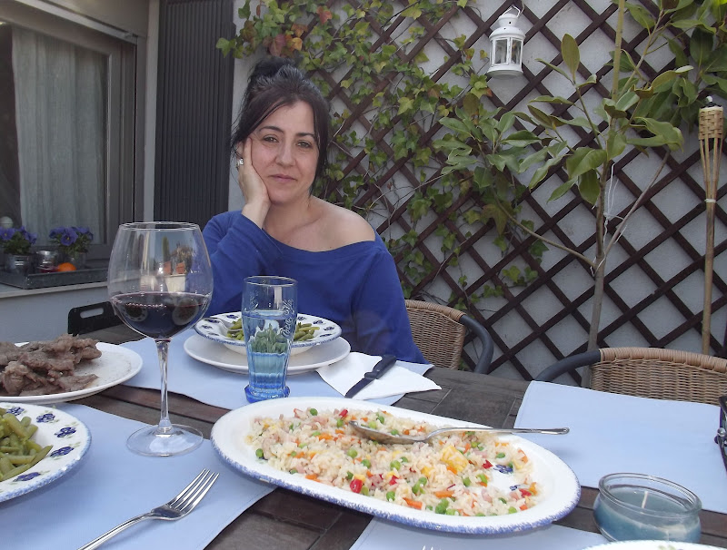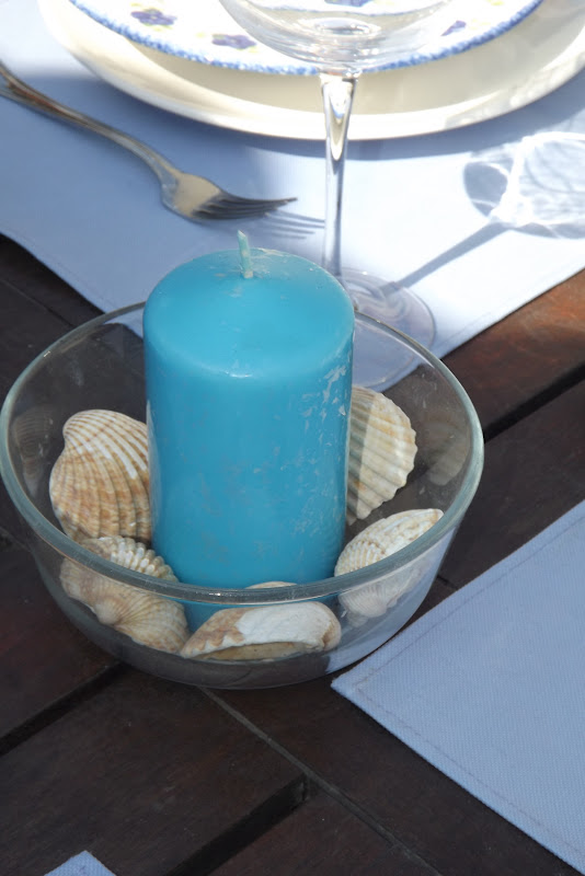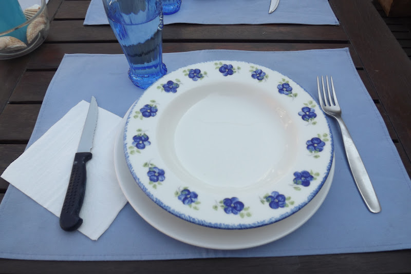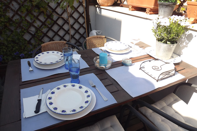 La mesa puesta y preparada en la terraza...Hoy sábado con el solecito del mediodia hemos preparado una agradable velada...Mantelitos individuales azules, vasos y vajilla a juego, todo rodeado del verdor de nuestro rincón preferido ahora que está a punto de comenzar la esperada primavera. Corría una ligera brisa algo fresquita, pero no nos ha importado, estábamos de maravilla... Después un buen café, por cierto, ¿A alguien le apetece tomárselo con nosotros?... Que el solecito primaveral que luce hoy os haga pasar un agradable sábado de finales de marzo...