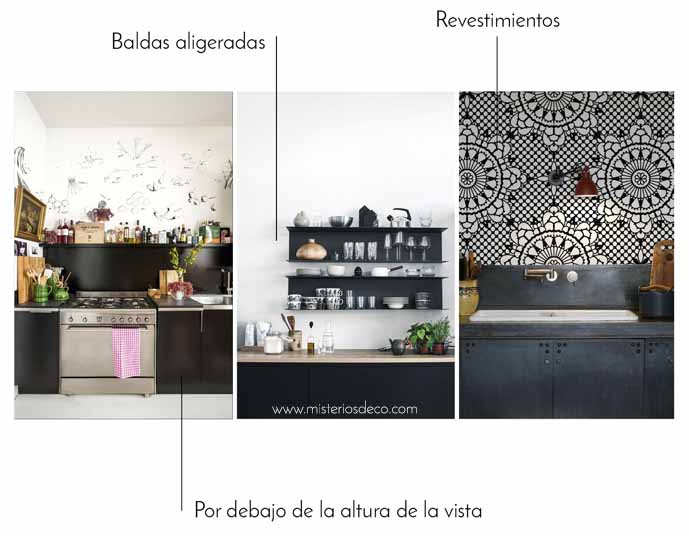 Baldas aligeradas: son una solución muy actual y asequible. Es una manera sencilla de introducir el negro o el color que prefieras sin tener que hacer un gran cambio. Y si no te gusta, siempre puedes pintarlas de otro color. En este caso ten en cuenta los complementos o el menaje que coloques encima porque el nuevo color no combina, la inversión será mayor.