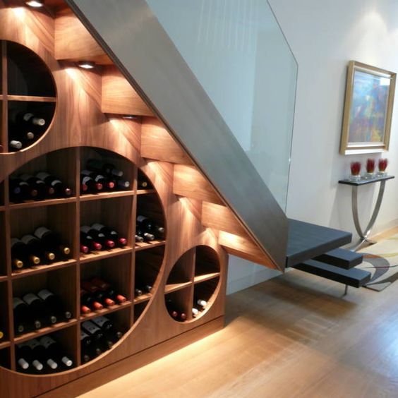 Si os gusta el buen vino daos el capricho de tener vuestra propia bodega en casa. Estas estanterías de madera con forma redondeada recuerdan a las barricas y son perfectas para albergar vuestras mejores botellas. Los spots encastrados terminan de completar esta preciosa bodega.