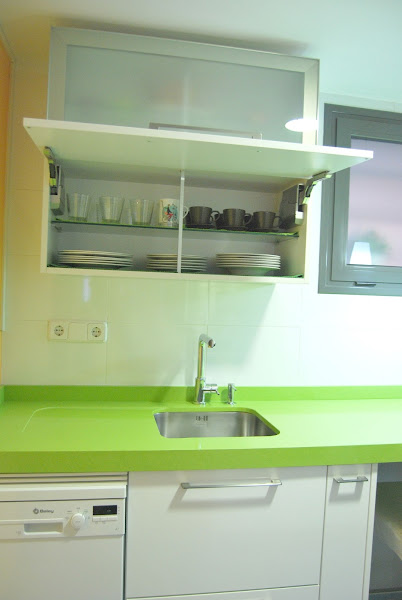 Veréis que lo que más destaca es el color de la encimera. Buscábamos darle un toque alegre a esta parte de la casa.