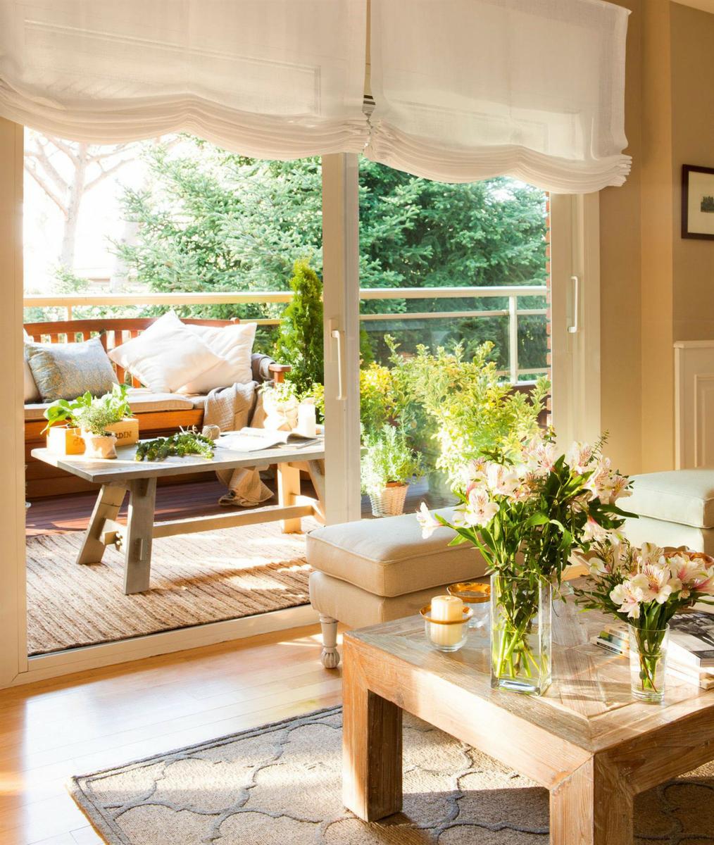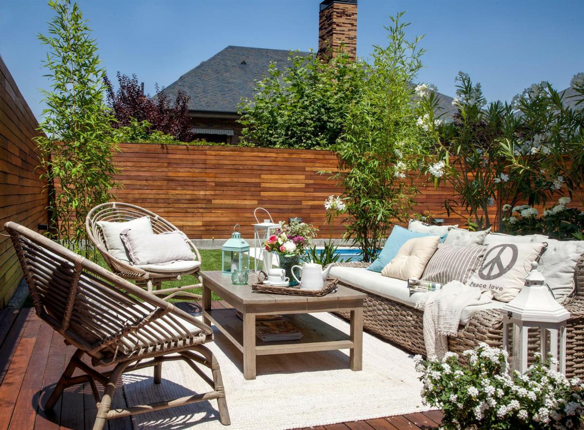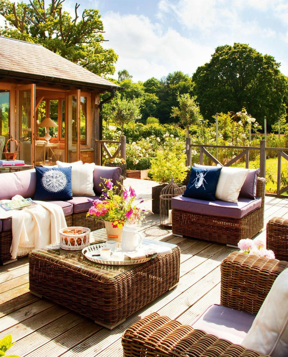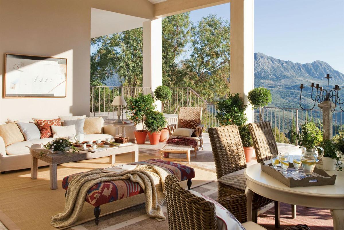 Las medidas generosas hacen que puedas jugar más con el estilo. Aquí los muebles pueden ser grandes (los de mimbre y fibras naturales están de moda) y los cojines más abundantes y llamativos. Eso sí, guarda la similitud decorativa, con el mismo tono y muebles similares que se relacionen.