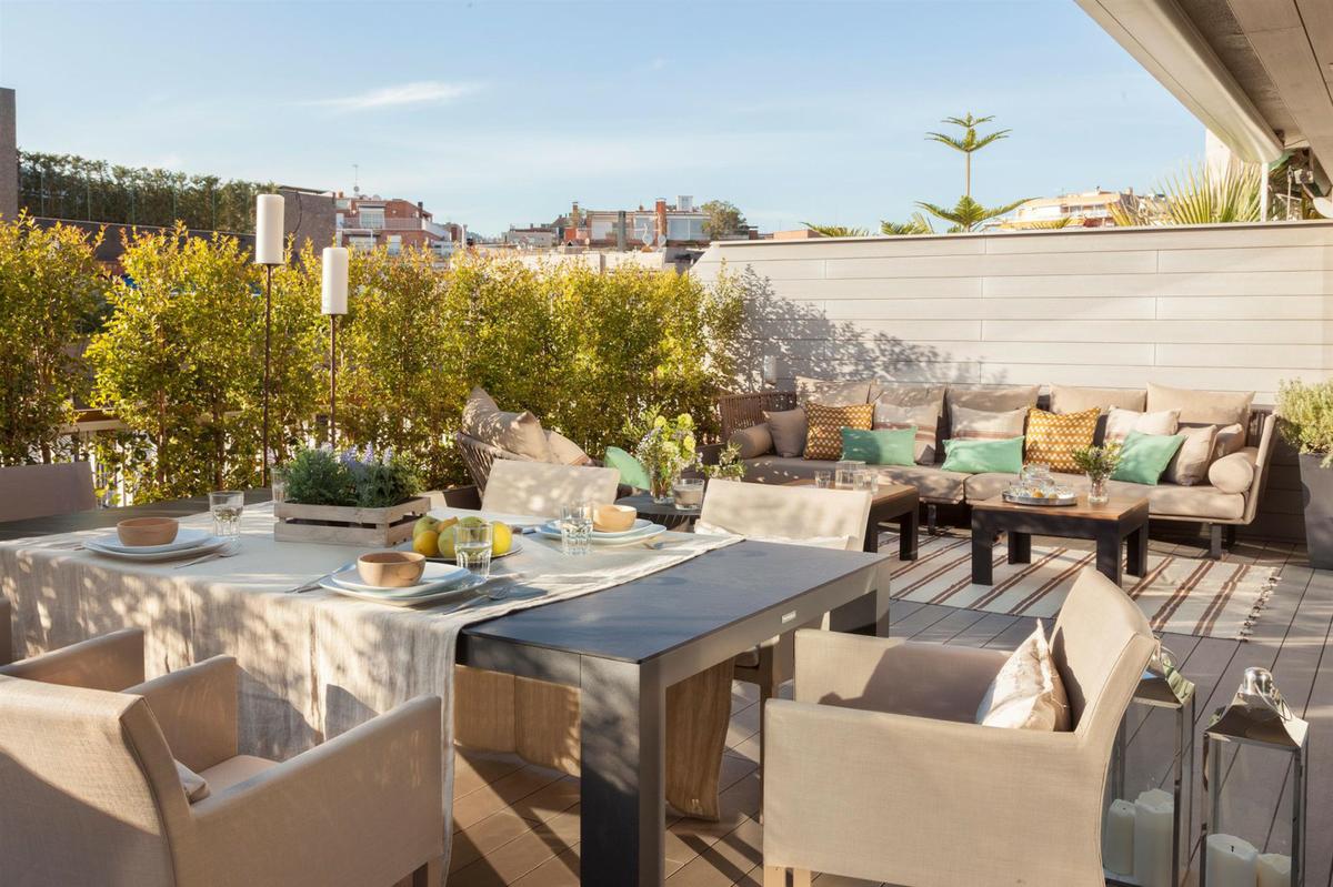 Las terrazas más grandes pueden adoptar la estética de los interiores sin problema. Decórala como un salón-comedor de interior e incluye zonas de ocio, con barbacoa a lo cocina exterior.