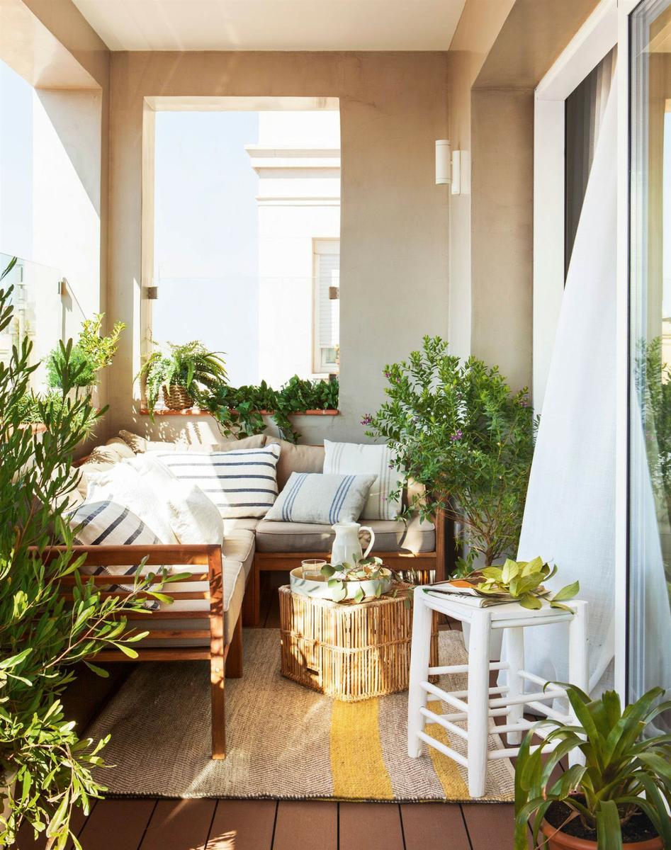 Si tienes un espacio alargado mejor una mesa rectangular y extensible (para seis personas debe medir 180 cm). Coloca sofás y sillones modulares para un exterior bien completito… Aquí puedes poner plantas más grandes y que no conlleven mucho mantenimiento, como palmeras, boj, cactus o ficus.
