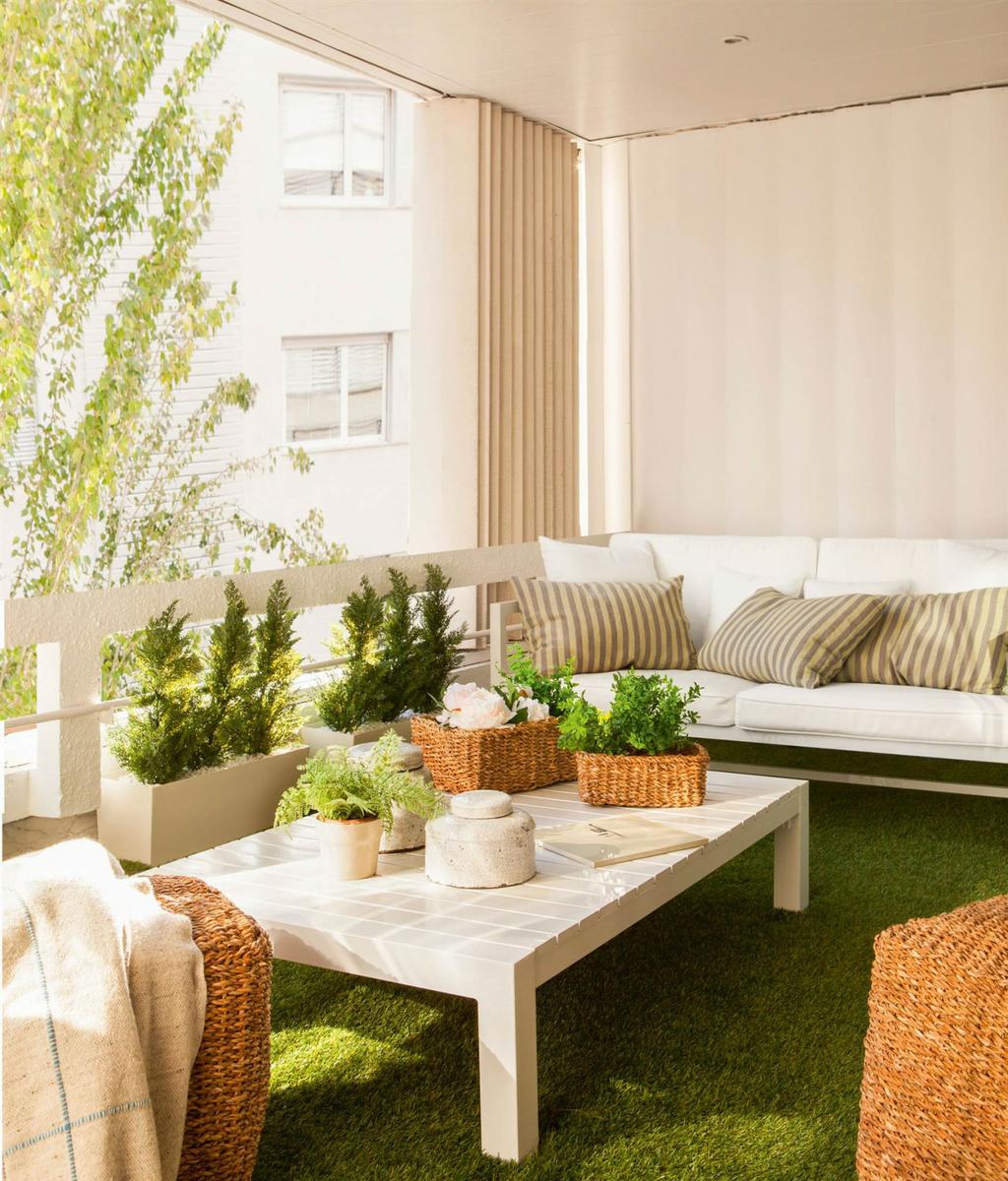 Un pequeño sofá rinconero tapizado en blanco, con tela especial para exteriores, es una buena idea para ganar confort y luminosidad en tu mini-terraza.