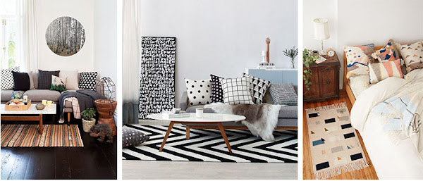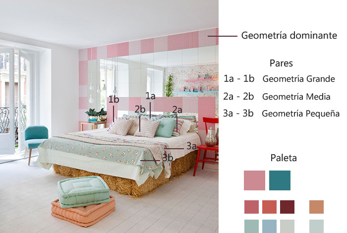 En resumen, escoger una paleta de color. Elegir tres patrones que contengan esos colores. Seleccionar un tamaño de dibujo distinto para cada uno lo que creará equilibrio y no competirán entre ellos. Introduce color en alguno de los modelos para dar protagonismo a algún elemento o pared.