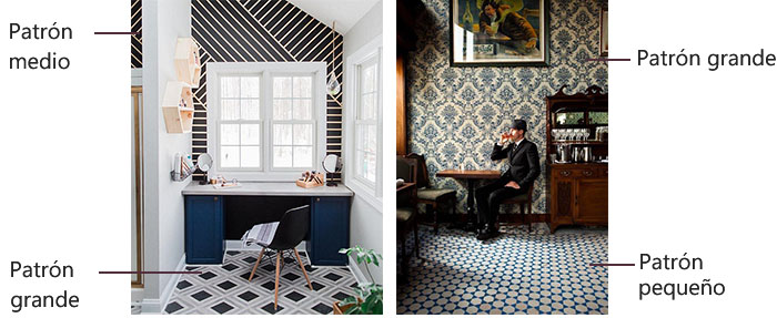 Una manera de combinar dos patrones sin que estos compitan es que sus geometrías o dibujos sean de tamaños distintos. Como en los ejemplos siguientes. De este modo aunque ocupen dimensiones similares visualmente no pesan sino que crean sensación de continuidad.