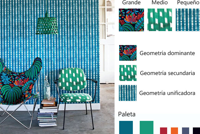 Escogí esta imagen porque representa muy bien lo que intentaba explicarte. Si te fijas en el esquema hay tres patrones cada uno de un tamaño distinto. El verde y el azul son similares tanto en geometría como en color. Eso consigue que encajen bien y se complementen. Por esto funcionarían bien para conseguir un efecto estático. Como te decía antes porque no compiten entre sí pero tampoco contienen ningún elemento que destaque. Si eso es lo que buscas puedes conseguir combinando patrones que sigan esta línea: colores análogos con diseños similares.