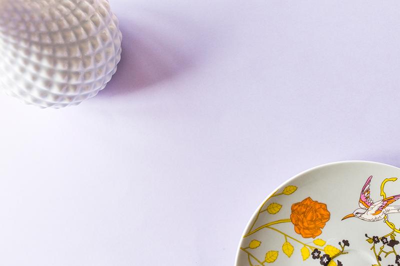 El plato rosa, sobre el folio amarillo, se ve malva.