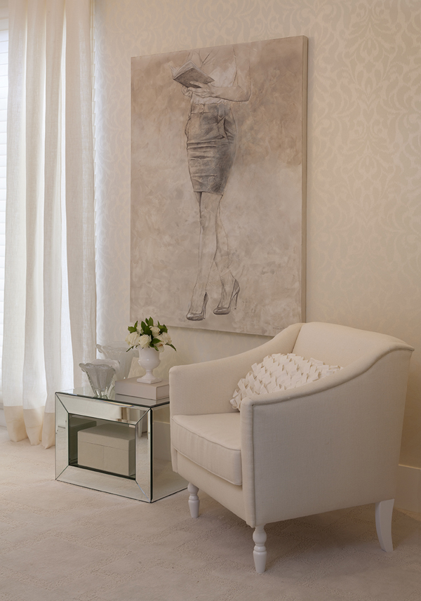 2* Muebles blancos/beige de la misma gama cromática que no destaquen mucho. En este caso para amueblar este dormitorio se han utilizado piezas de lineas rectas y con las butacas le ha dado ese aire romántico.