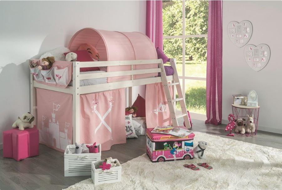 Elige una litera de este estilo que, con un buen colchón, garantizará el descanso de los más pequeños. Después, añade accesorios divertidos, como este túnel o las cortinas para que tengan su propio fuerte. Seguro que no tendrás problemas a la hora de que se vayan a la cama.