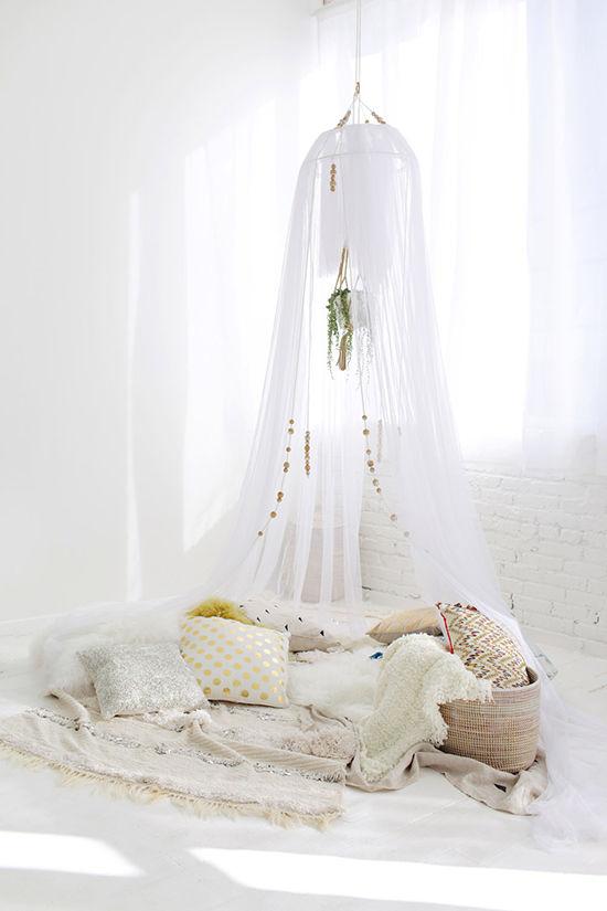 Crear nuestra propia tienda de campaña, para disfrutar de un corner delicado y sorprendente donde pasar la noche escuchando música, las tardes leyendo, o una siesta de esas que nos reponen del calor.