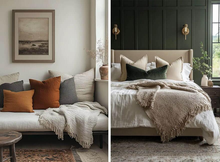 La elección de colores y texturas también es clave para generar un ambiente relajante. Tonos neutros y terrosos, como el beige, el gris piedra, el verde oliva o los colores arena, aportan serenidad y armonía al hogar. Combinar diferentes texturas naturales, como el lino rústico con algodones suaves o mantas de lana gruesa, aporta riqueza sensorial y una sensación acogedora.Adore charlotte/The mixxery