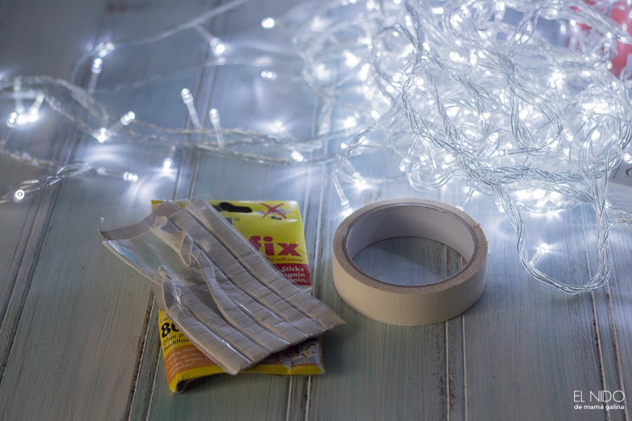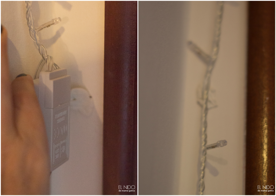 Además no puede ser más fácil de hacer, lo único que necesitas es una guirnalda de luces led muy larga, y masilla para pegar posters o cinta de pintor para no estropear la pintura. Antes tenía otra guirnalda pero se me acabó fundiendo y este año he comprado una de 12 metros, que es la más larga que había en la tienda y que tiene programa de esos con efectos "chispeantes", muy chula.