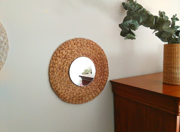 Pero los otros dos los he credo yo con dos manteles individuales comprados en IKEA; el modelo SNAR 1,99€ hecho con hojas de palma y el modelo SOARÉ 3,99€ creado con jacinto de agua. También adquirí un espejo de mano, de los que usamos para el tocador en un bazar por 2,50€....en resumidas cuentas con un presupuesto de 8,50€ dos espejos estilo sol.