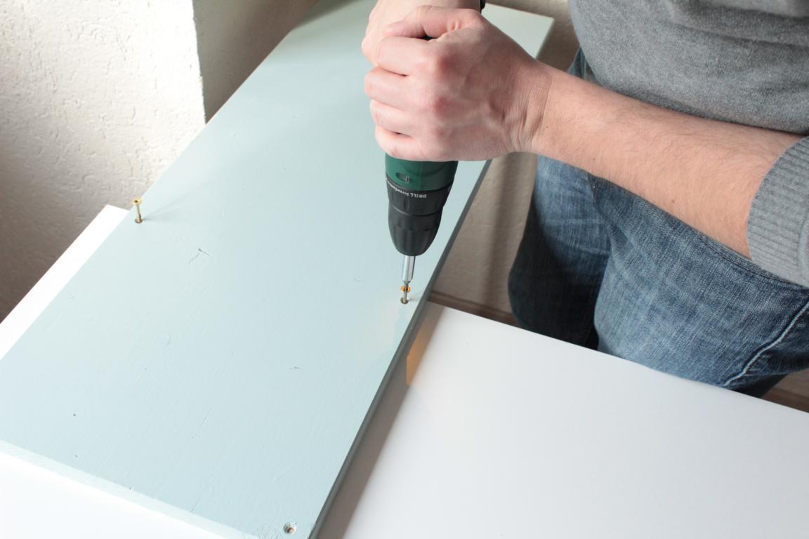 @ArianeBrand A continuación, en uno de los lados añadimos la tabla de madera que hemos pintado previamente del color escogido y la fijamos en la estantería – mostrador con 4 tornillos (atención, la madera del estante está hueca, eso quiere decir que los tornillos tiene que ser pequeñitos). También la fijamos al suelo con el pie de mesa.