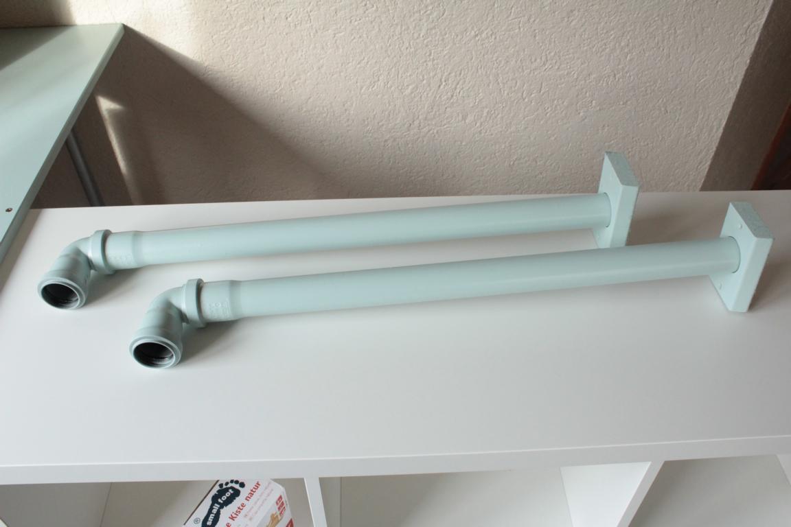 @ArianeBrand Ahora vamos a montar la estructura que soporta el tendal. Primero pegamos los tubos en los bloques de madera por un lado y en el otro colocamos los tubos con ángulo de 90ºC. Estas dos estructuras una vez pintadas ya se pueden atornillar en cada uno de los extremos de la estantería-mostrador. Y finalmente añadimos el tercer tubo más largo que unirá los dos tubos pequeños.