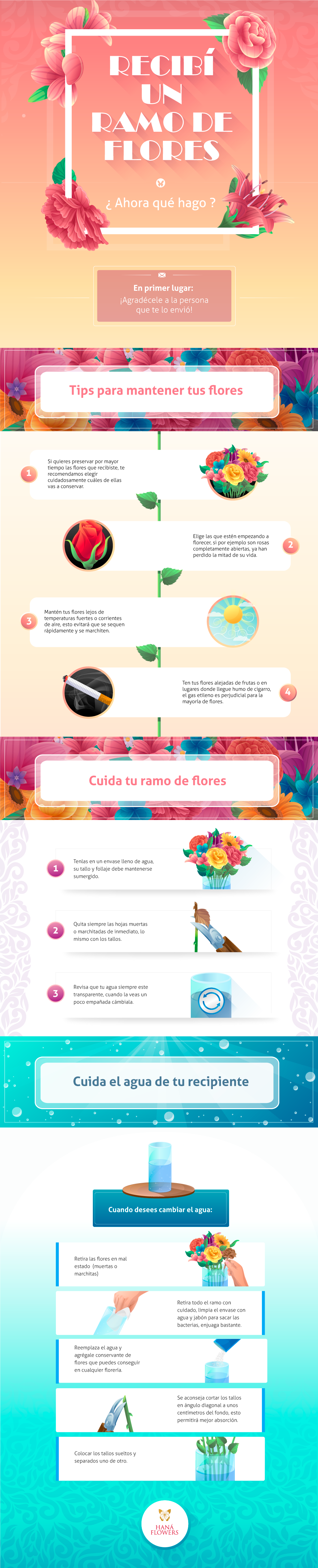 Para eso, Hana Flowers ha creado una excelente infografía pensado en el cuidado de tus flores, con algunas recomendaciones sobre cómo mantenerlas frescas, renovadas y con más brillos.