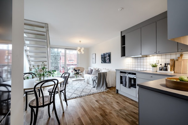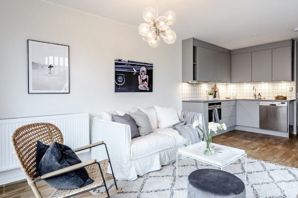 El resto a la hora de buscar la luz y darle mayor amplitud es una alfombra beréber, una mesa blanca muy sencilla y una lámpara vintage. Por supuesto, los cojines en gris crean una sensación mucho más agradable.