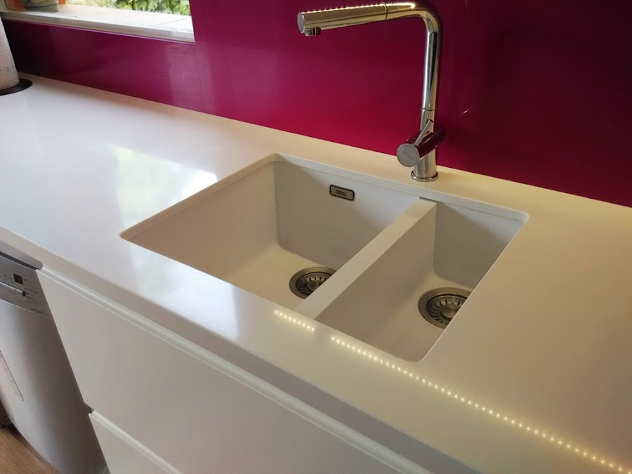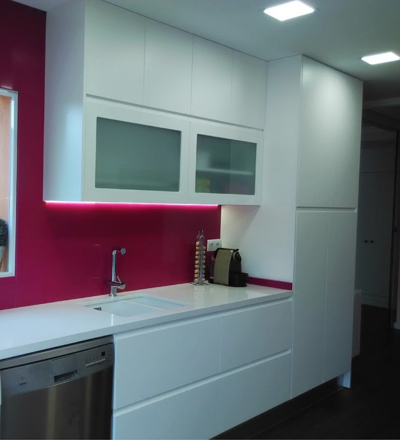 Se trata de un modelo en DM lacado blanco satén con tirador incorporado uñero a juego, encimera de Compac Absolute blanc y pared frontal -o aplacado- de Silestone Magenta energy en ambos lados.