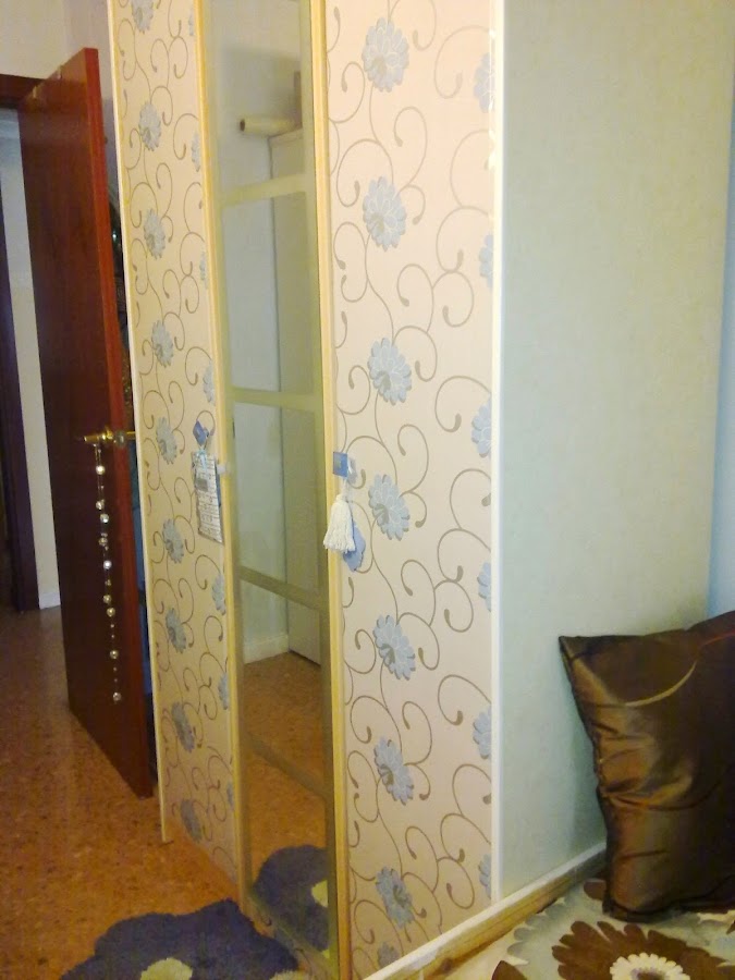 Después a las dos puertas que no tienen espejo se les ha aplicado un papel plástico que se pega a la superficie (tipo Aironfix). No olvidar antes de su aplicación mojar con agua jabonosa la superficie a tapar para poder mover el papel hasta su colocación definitiva (esto es muy importante porque el papel auto-adhesivo tiende a pegarse rápidamente y dejar burbujas que después estropearía bastante el resultado final) Si aun así queda alguna burbuja se pueden pinchar con una aguja. Naturalmente este tipo de papel tiene ventajas e inconvenientes, la ventaja sería que sólo tienes que pegarlo y que es mucho más fino que un papel de pared por lo que se puede aplicar en superficies que tengan formas, por ejemplo curvas. El mayor inconveniente es que es mucho más difícil de manipular que un papel pintado normal de paredes. Por eso, cada uno tiene que valorar que prefiere utilizar. El papel se debe despegar muy poco a poco y ayudarte con una esponja o trapo para ir alisándolo.